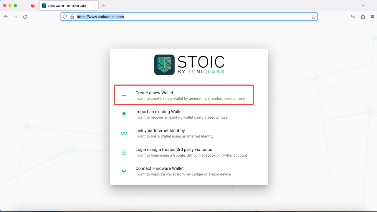The next step would be to click on Create a new wallet in case this is your first time using Stoic. A user with an existing wallet can also use "Import an existing wallet" "Link an existing internet identity," and so on. However, in this guide, we'll cover the first option, which is how to create a new wallet.