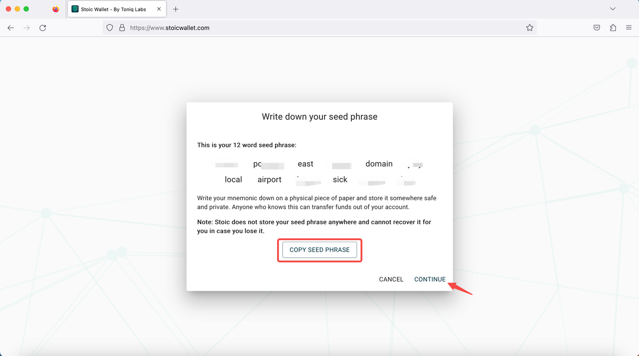 This phase might be considered the most important while setting up a new wallet. The user is prompted to copy and save the 12 words as seed phrases. Right after putting the seed phrase to safe, hit "Continue"